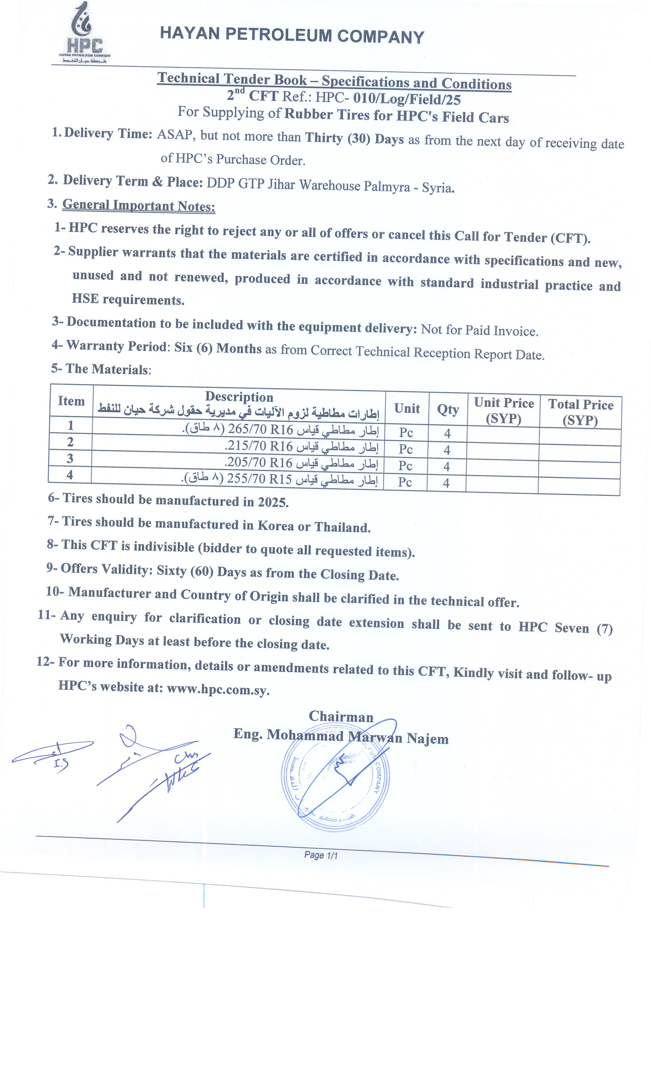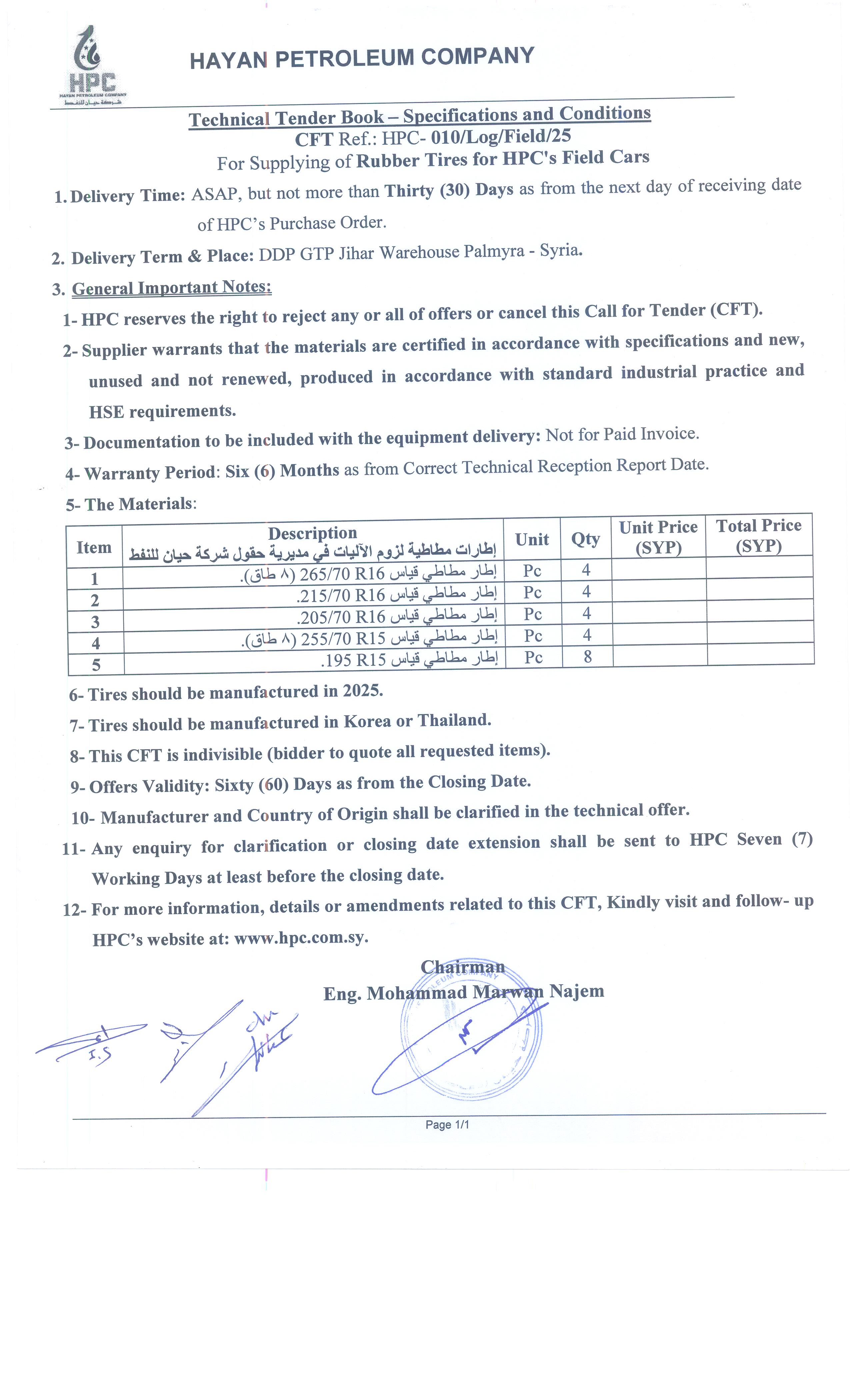 For Supplying of Rubber Tires for HPC's Field Cars. |