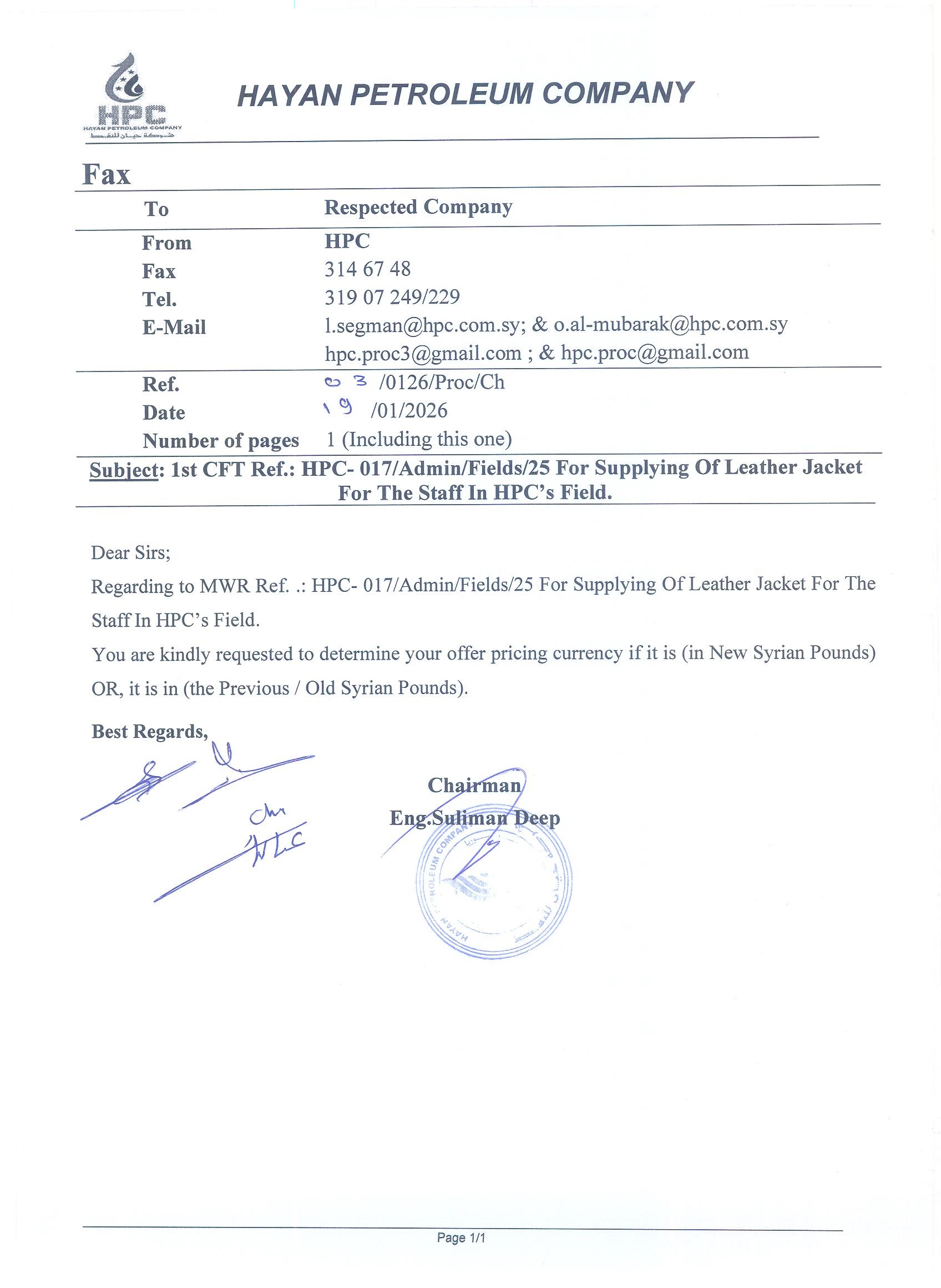 For Supplying of Leather Jackets For The Staff in HPC’s Field |