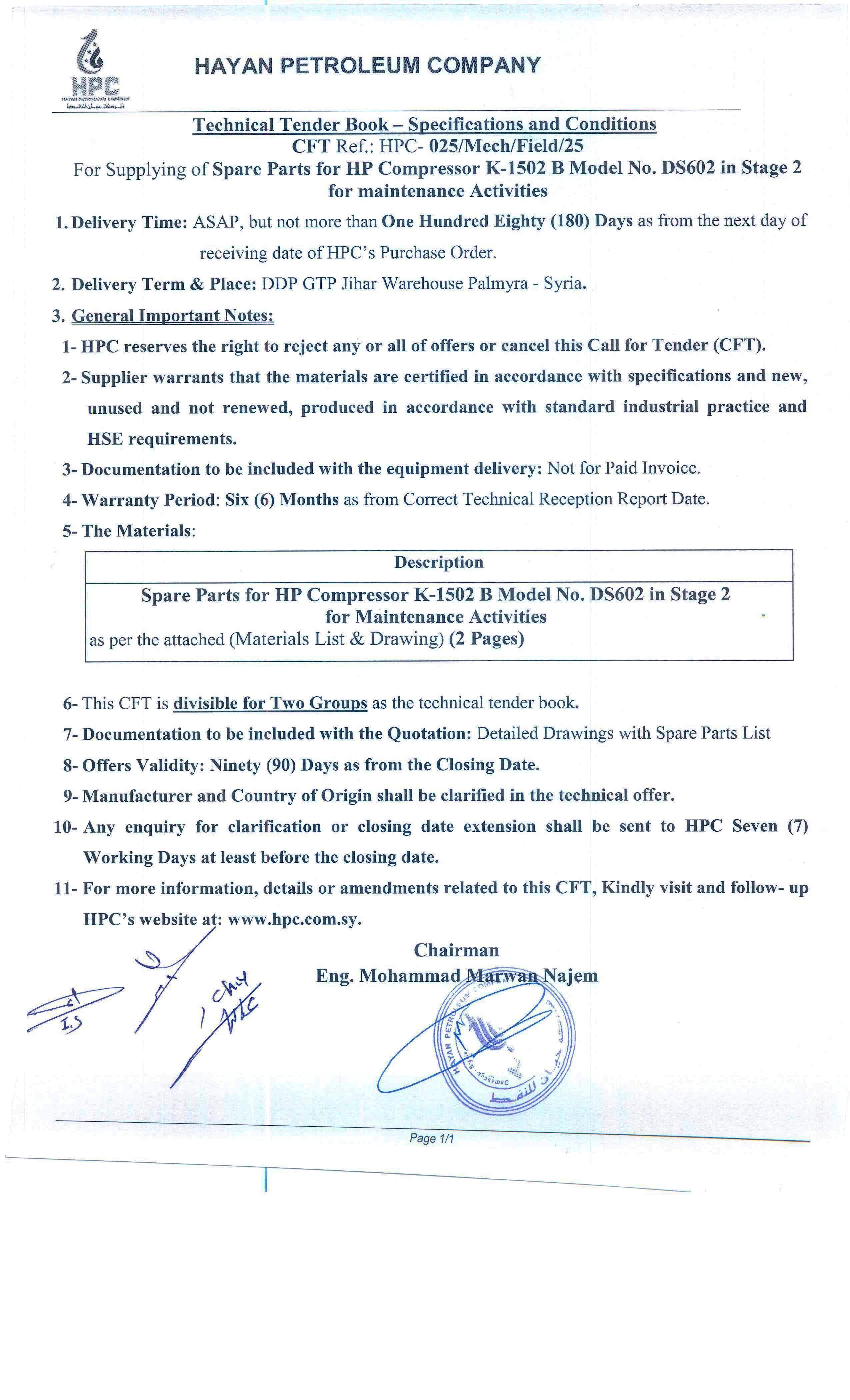 For Supplying of Spare Parts for HP Compressor K-1502 B Model No.